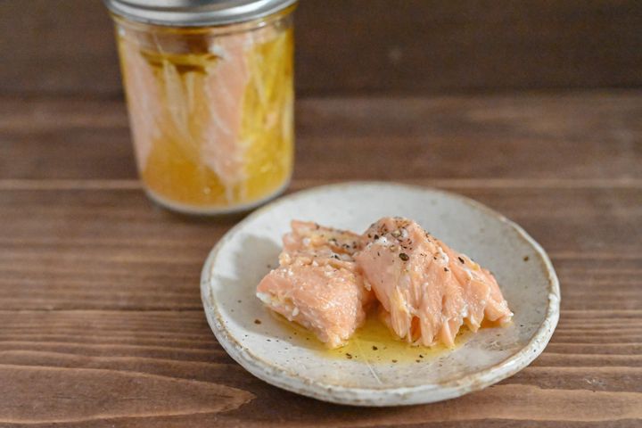 オリーブオイルに浸されたサーモンは加熱してもパサつかず、おいしい食感に仕上がりますよ。