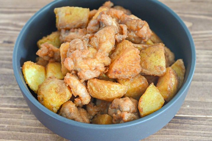 揚げた鶏肉とじゃがいもに甘酸っぱいたれが絡む、