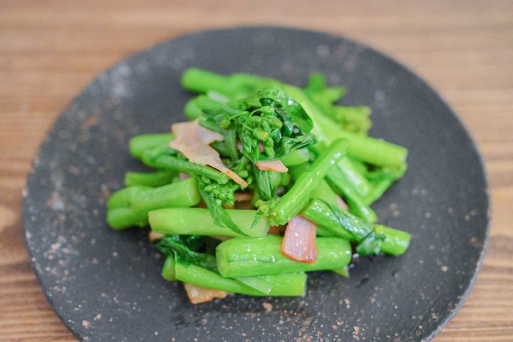 アスパラ菜をベーコンと炒め合わせるレシピです。