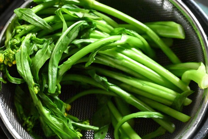 (2)鍋に湯を沸かし、アスパラ菜の茎から入れる。葉先まで沈めて30秒たったら湯切りして水気をしっかり絞り、食べやすい大きさに切る。