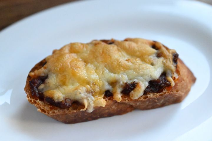 (1)フランスパンに「食べるガラムマサラ」をぬり、ピザ用チーズをかける。