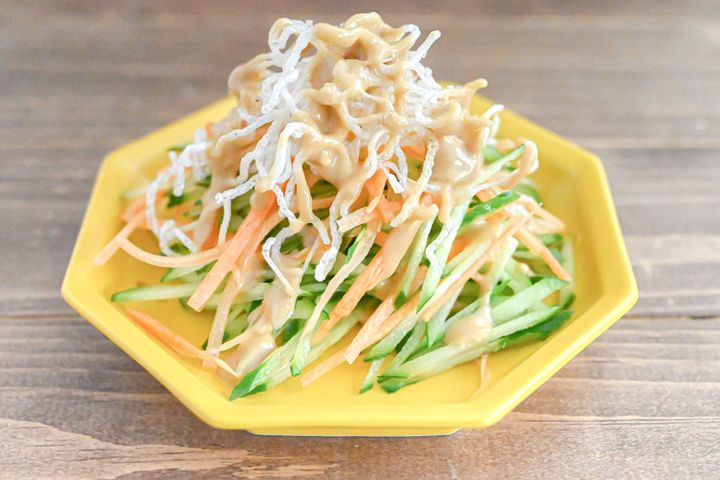 (4)きゅうり、にんじん、はるさめを皿に盛り、ドレッシングをかけて完成。