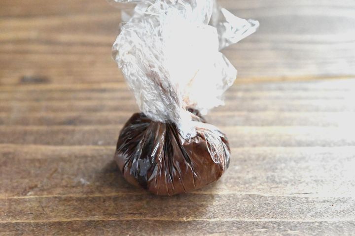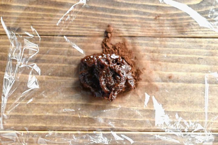 (5)ラップの上にココアパウダーをのせ、