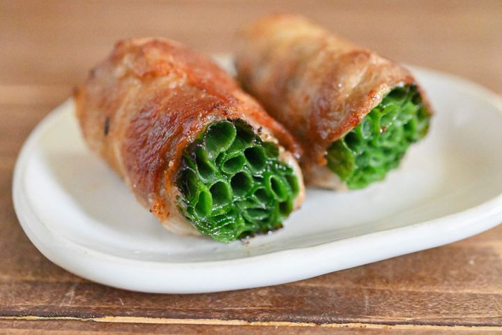 豚バラ肉に巻かれた小ねぎは蒸され、旨味たっぷりに仕上がりますよ。