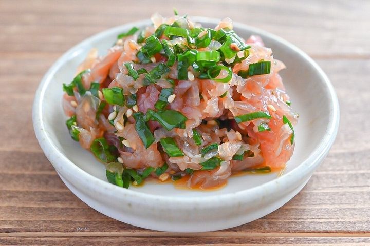 生ハムにたっぷりの小ねぎを合わせるひと品です。