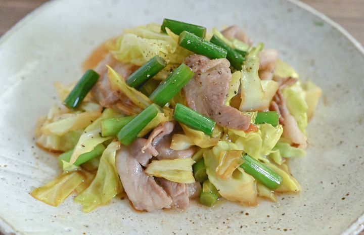 (5)キャベツに火が通るまで加熱し、塩で調味して完成。