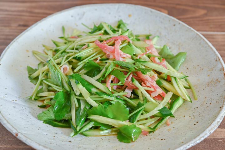 (1)きゅうりとベーコンは細切りに、三つ葉はざく切りにする。