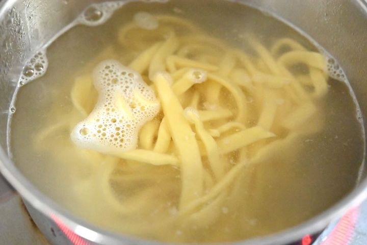 (7)たっぷりの湯を鍋に沸かし、3分ほど茹でる。