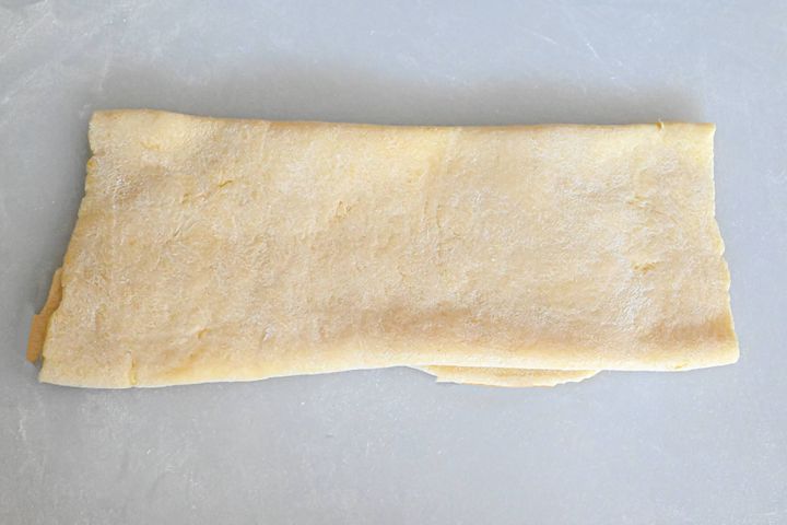 (5)打ち粉をし、厚さ1mmになるまでめん棒でのばし、3つ折りにする。