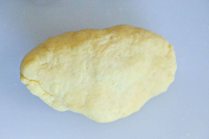 (3)台に取り出し、生地を外側から中央に折り返し、両手で体重をかけて表面が滑らかになるまで5分ほどこねる。