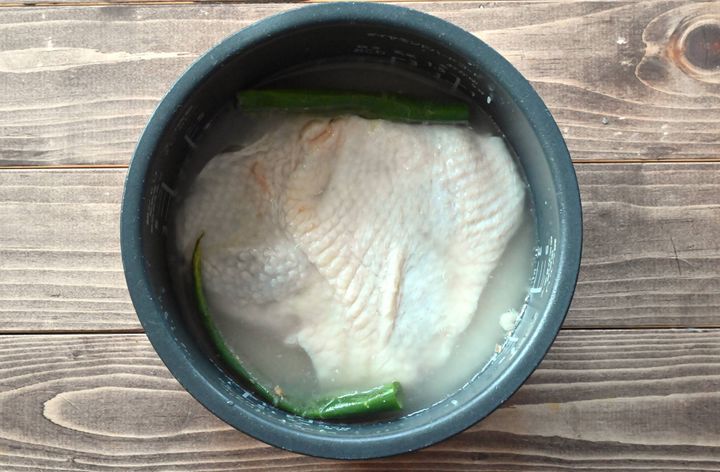 鶏がらスープの素、にんにく、しょうがを加えてひと混ぜし、鶏もも肉、長ねぎをのせる。