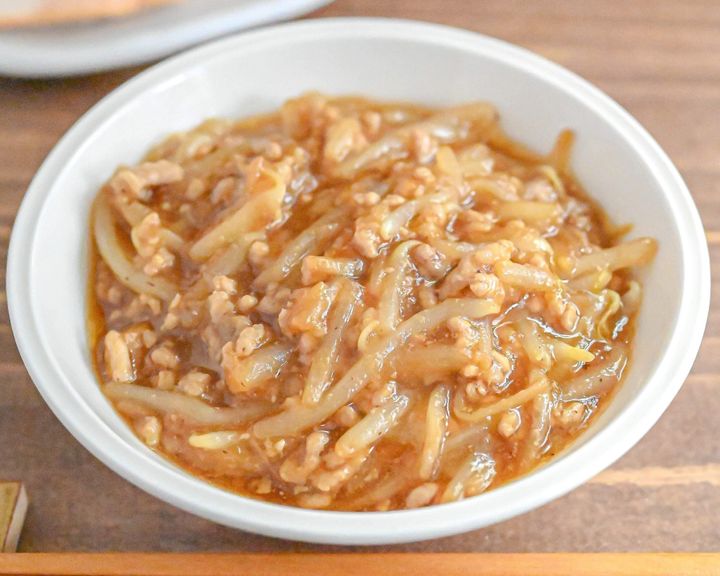 もやしと豚ひき肉、安価な食材の組み合わせで作れる副菜レシピです。