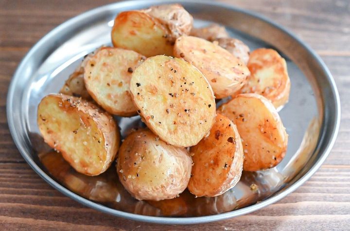 (4)新じゃがいもを入れ、揚げ色がつくまで加熱して取り出し、