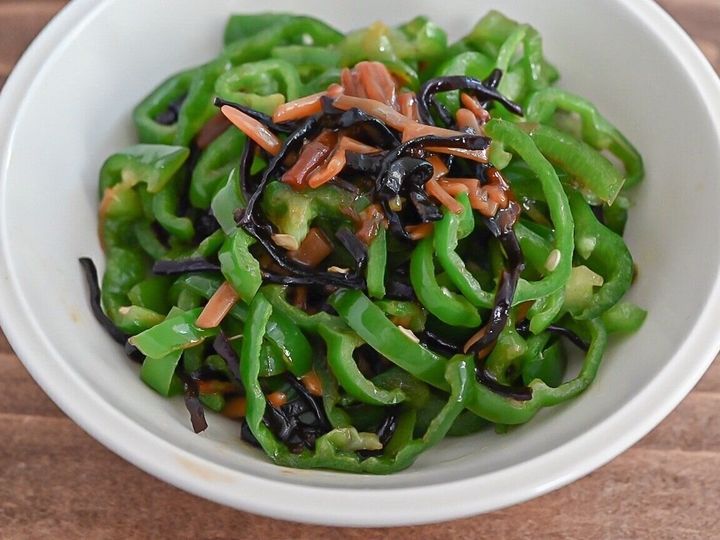 (1)ピーマンを繊維を断つように1㎝幅に切る。