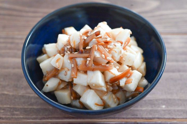 (3)なめたけ、塩昆布を加えて全体にいきわたるように混ぜ合わせて完成。