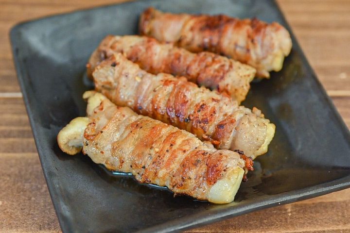 エリンギに豚バラ肉を巻いて加熱するレシピです。