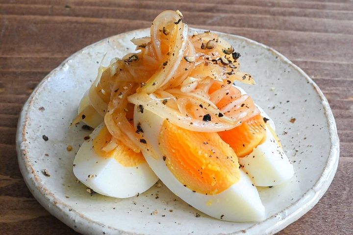 やみつきになる味わい!ゆで卵の玉ねぎのせ