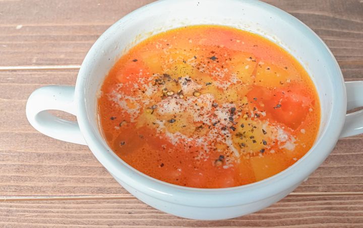 (4)パプリカが柔らかくなってきたら水400mlを加えて沸騰するまで加熱し、塩で調味する。
