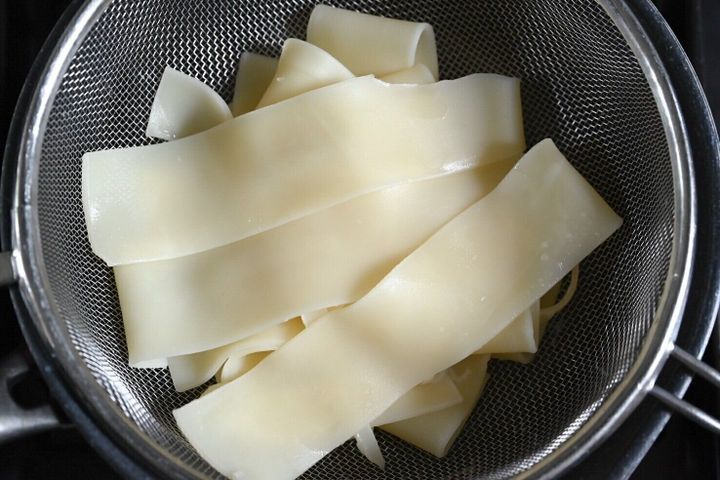 (5)ビャンビャン麺を1本ずつ加え、12分加熱して湯切りする。