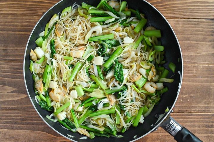 ビーフン、シーフードミックス、 小松菜、 ねぎの順番で重ね入れる。