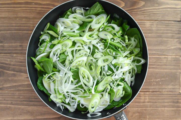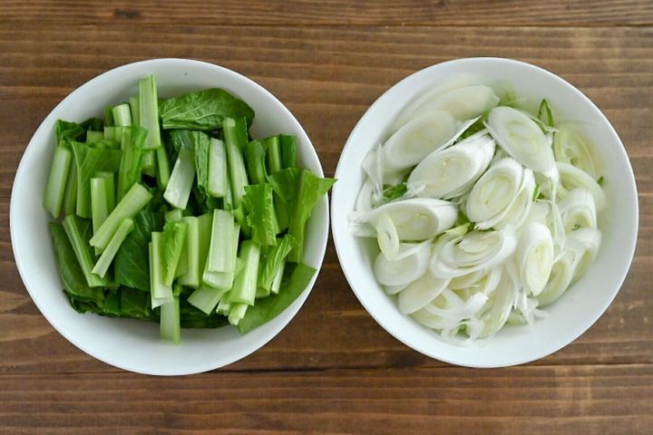 (2)小松菜4株をざく切りにし、長ねぎ1本は斜め薄切りにする。