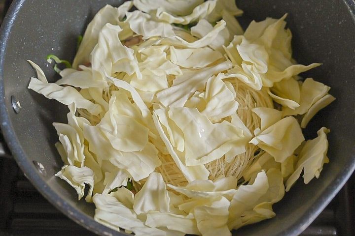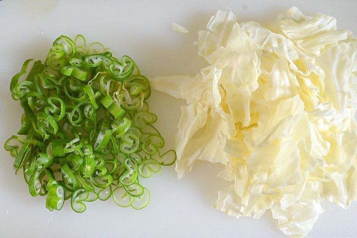 (1)長ねぎを薄切りに、キャベツは食べやすい大きさに切る。
