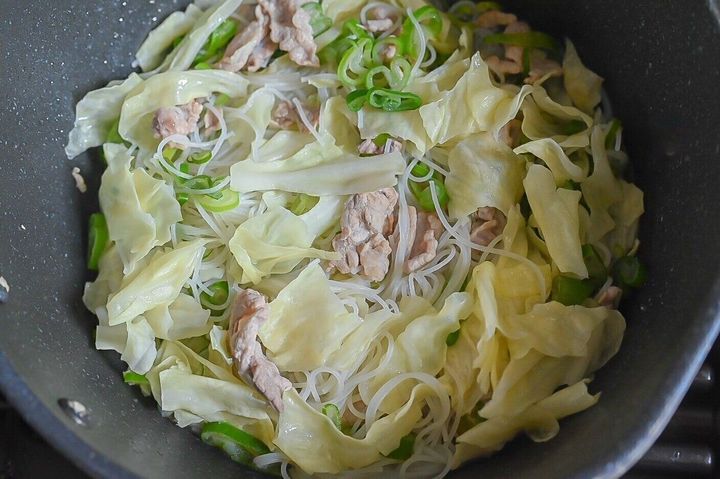 (3)フライパンにサラダ油を入れ、豚こま切れ肉、長ねぎ、ビーフン、キャベツの順に入れる。