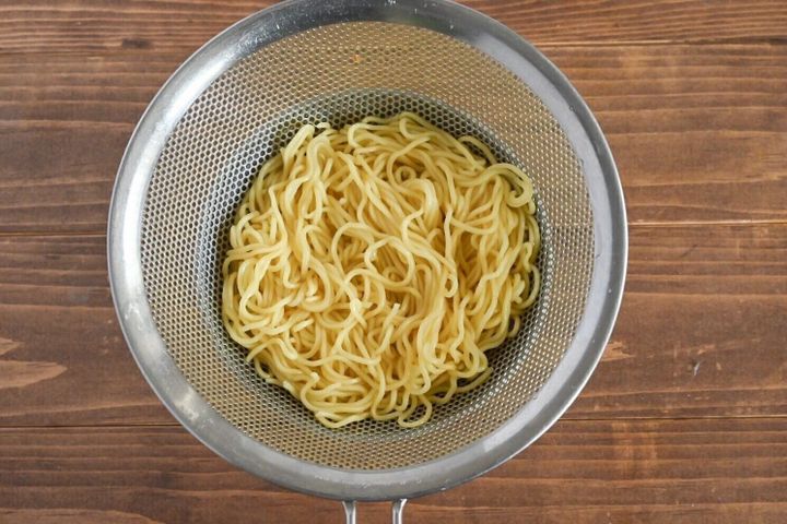 (6)鍋に湯を沸かし、麺を入れて4分ゆでて湯切りをする。