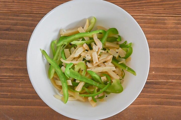 (3)ピーマンを入れてさらに1分炒め、塩・こしょうをして取り出す。