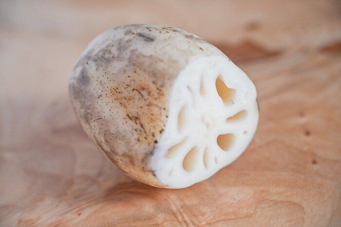 ほうれん草は根元の部分に泥や汚れが入り込んでいます。これらの汚れは流水でさっと洗い流すだけではきれいに落とすことができません。根元まできれいに洗うためにはまず、キッチンバサミでほうれん草の根元に十字の切り込みを入れましょう。