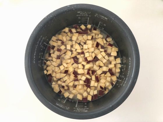 ③酒と塩を加えて軽くまぜ、水切りした①のさつまいもを入れて普通炊きをする。