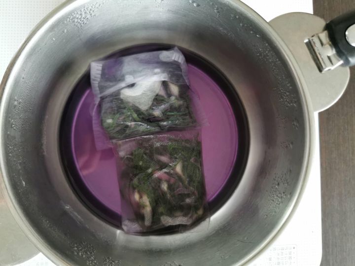 (2)水200mlを鍋にいれて沸騰させ(1)をいれ2分程煮て、色を出す。