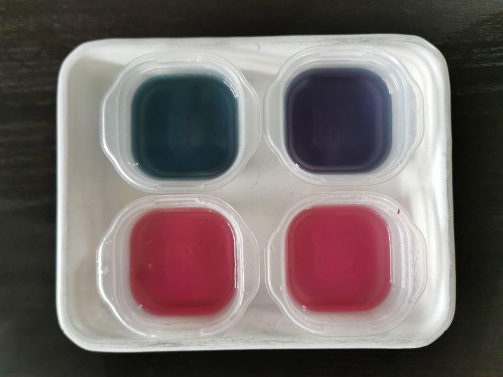レモン汁、重曹を加えて混ぜるとそれぞれ色が変ります。
