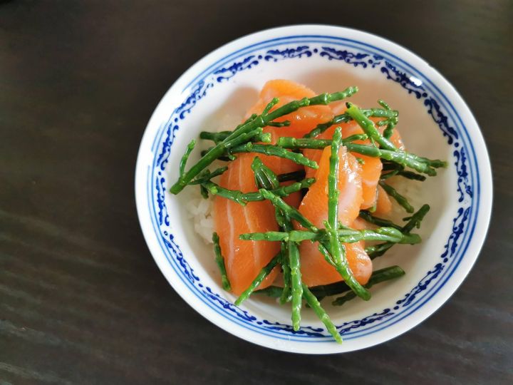 このシーアスパラガスを水洗いし、生のサーモンをあわせて、