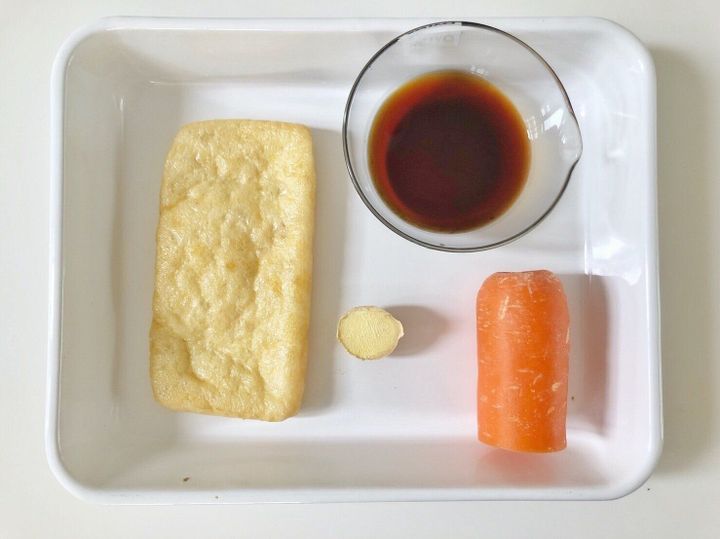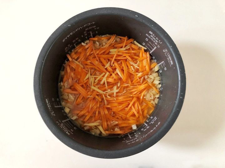 (3)生姜、人参、油揚げを千切りにし、(2)と合わせ普通炊きをする。