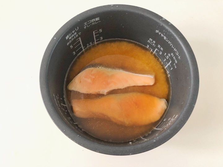 (1)お米を研ぎ、2合目のメモリまで水を入れ、大さじ3の水を捨てる。