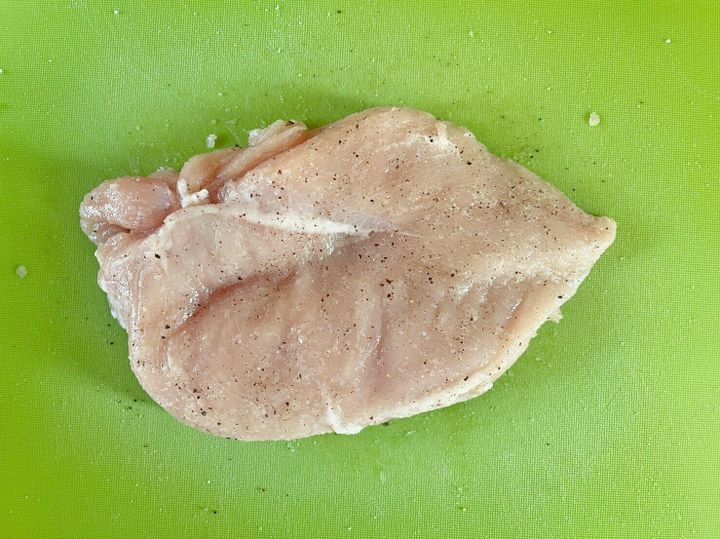 (1)鶏むね肉は皮をとり、塩・胡椒をして冷蔵庫に一晩置く。