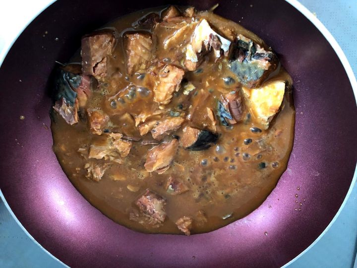 (2)サバを崩しながら、水分を飛ばすように炒めていく。