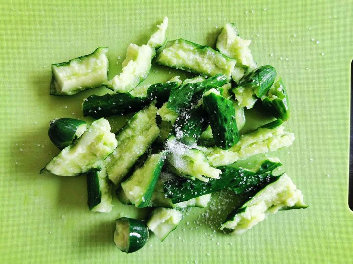 (1)きゅうりを叩いて割り、塩をふりかけて少し置いておく。
