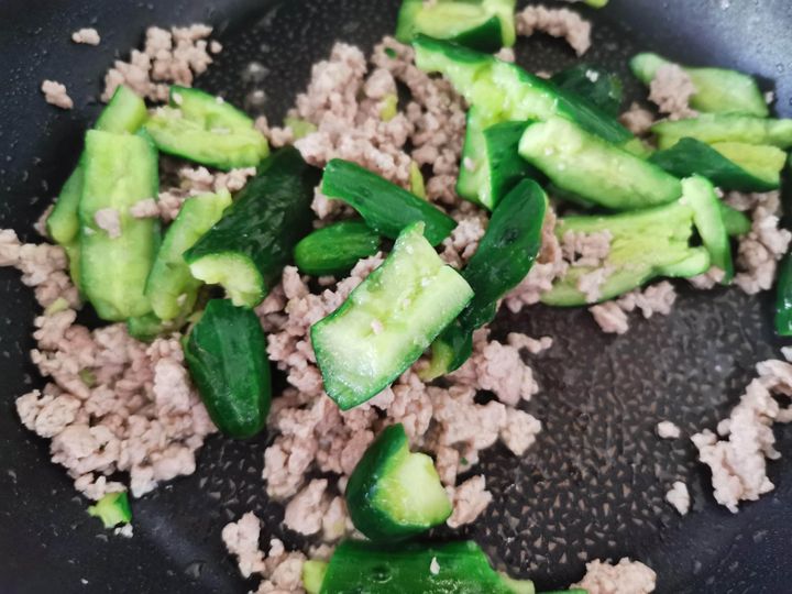 (3)(2)に水気をきった(1)のきゅうりを入れてさらに炒める。