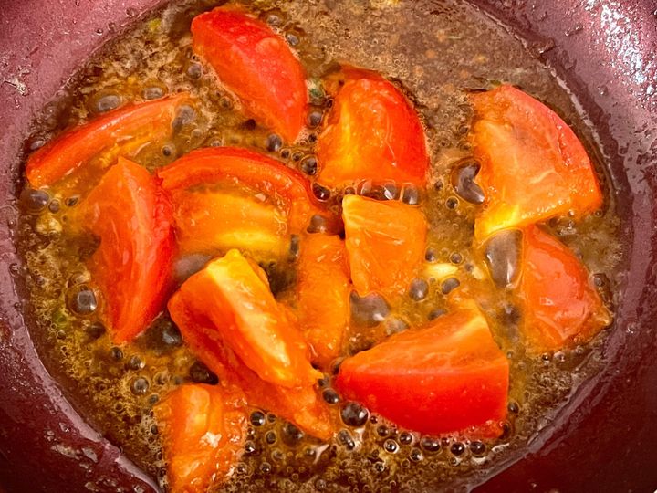 (2)ごま油をひいたフライパンにトマトを入れ、