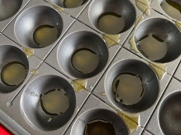(2)タコ焼きプレートにオリーブオイルを入れて加熱する。