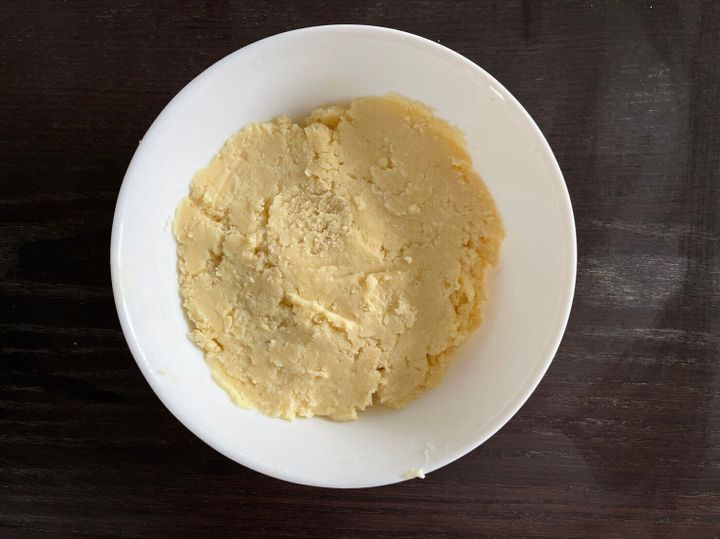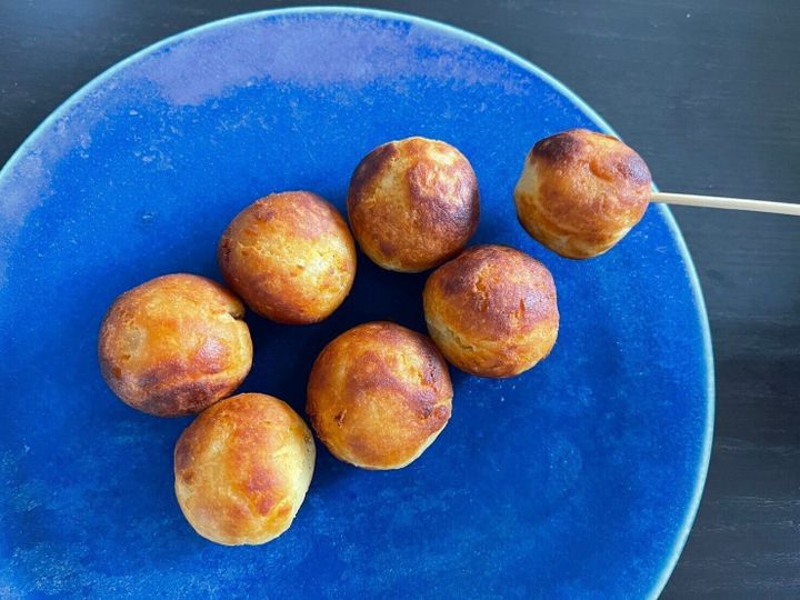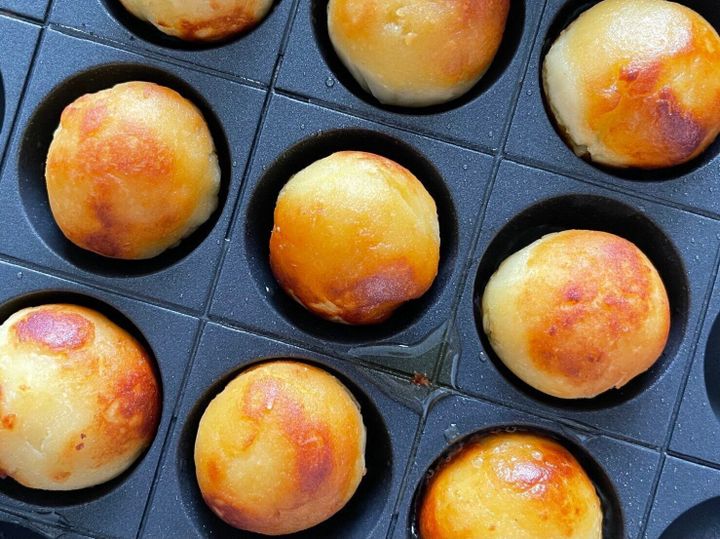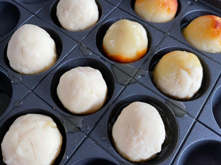 (3)(1)を手で丸めて、タコ焼きプレートに入れていく。