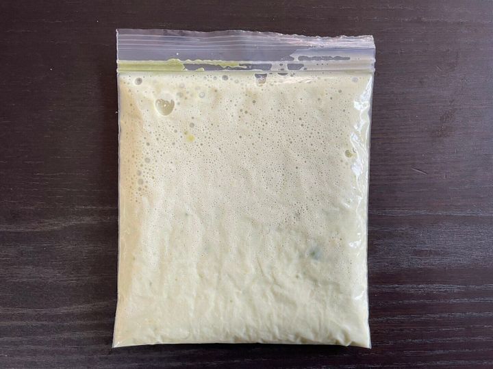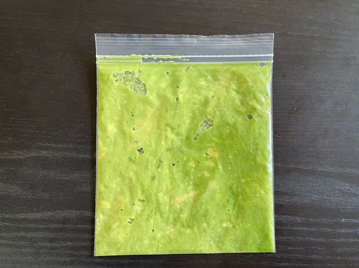 (1)冷凍できる保存袋にアボカドとレモン汁を入れてよく揉みこむ。