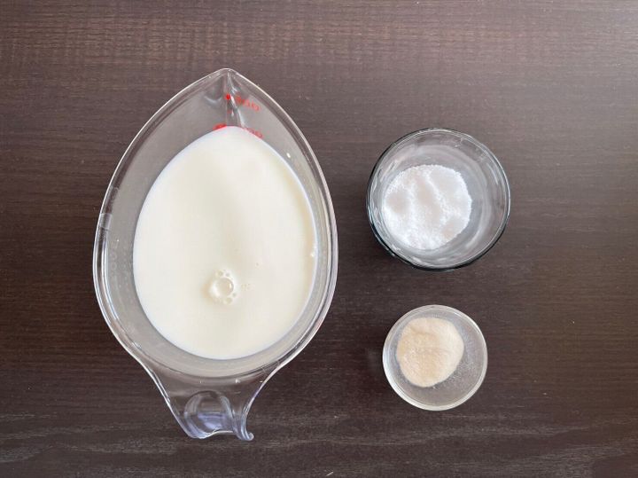 2.牛乳、粉寒天、砂糖をあわせて弱火にかけ、とろみがつくまで加熱する。