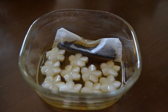 ・保存容器に、型抜きした大根・ゆかりを入れたお茶パック・かんたん酢100ccを入れる。