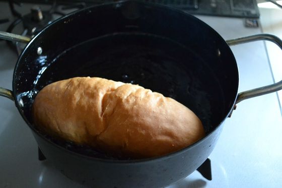 ①コッペパンを180℃~190℃に熱した油で、両面を揚げる。