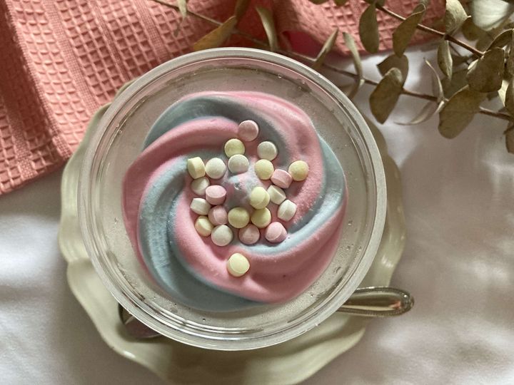 水色のソーダアイスとピンクのストロベリーアイスが渦巻きでカップに入っており、上には3色のラムネがトッピングされています。