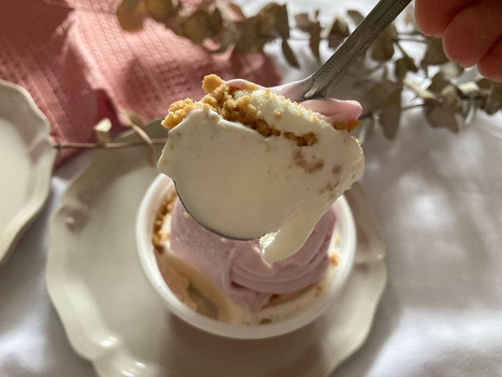 下の層には白桃ソースが入ったミルクアイスにクッキークランチがかかっています。