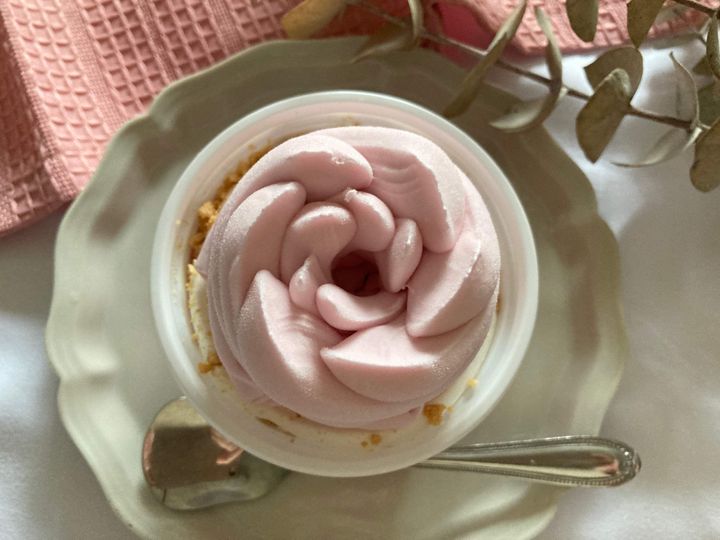 カップの蓋を開けると、ピンクのお花型のアイスが目を引きます!!味は白桃アイスになっています。
